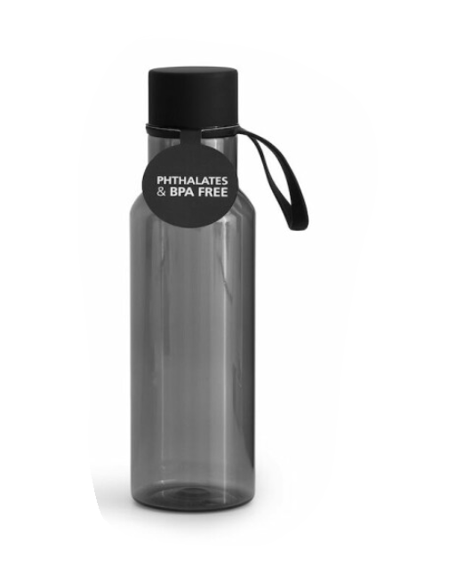 Stilren och praktisk vattenflaska gjord i BPA-fri tritanplast. Locket är av rostfritt stål täckt i svart gummi för bra grepp när du ska öppna flaskan. Öglan gör det möjligt att till exempel hänga flaskan på träningsväskan.