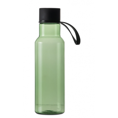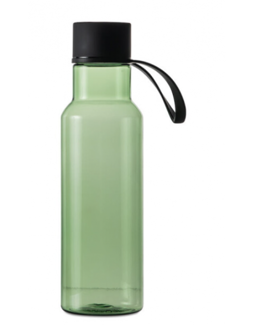 Stilren och praktisk vattenflaska gjord i BPA-fri tritanplast. Locket är av rostfritt stål täckt i svart gummi för bra grepp när du ska öppna flaskan. Öglan gör det möjligt att till exempel hänga flaskan på träningsväskan.
