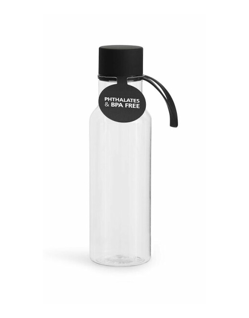 Stilren och praktisk vattenflaska gjord i BPA-fri tritanplast. Locket är av rostfritt stål täckt i svart gummi för bra grepp när du ska öppna flaskan. Öglan gör det möjligt att till exempel hänga flaskan på träningsväskan.