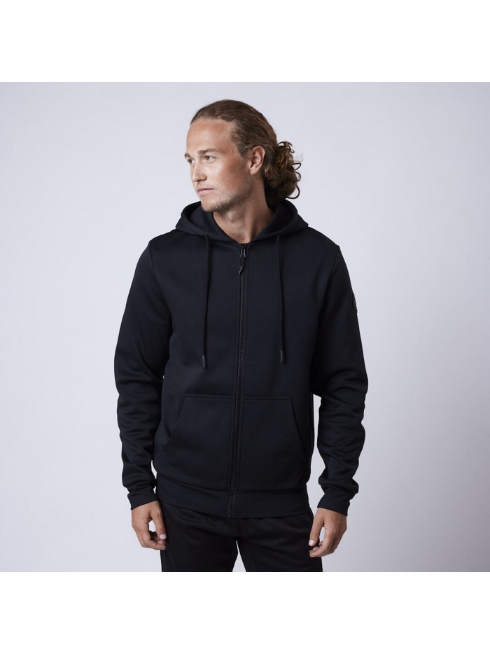 Hoodjacka med 2 sidfickor med dragkedja och 2 innerfickor. Kontrasterande mesh i huvan. 2x2 stretchribb i muddar och avslutet nedtill. Borstad insida. Ton-i-ton flatlocksömmar samt en smart detalj för att kunna bära hörlurar.
